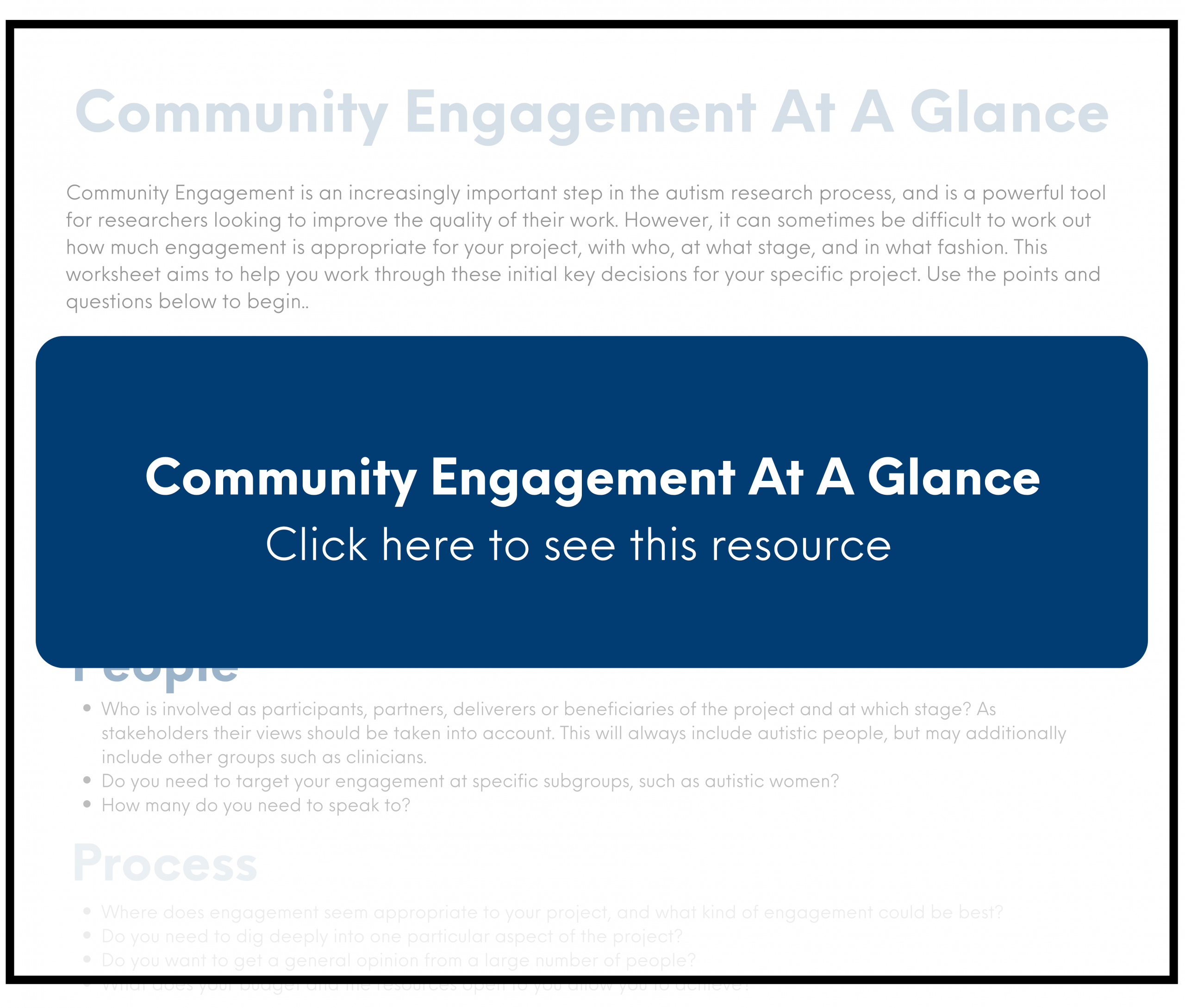 The research passport was created to address a need for a simplified, pictorial resource for use by adults and children with intellectual disabilities. The booklet aims to be an information sharing resource between autistic people and researchers.